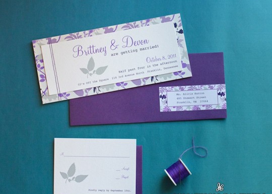 The Knot says going bold with "papers in fabulously rich purple hues with white lettering" is the way to go this year. Invitation Crush thinks purple never really goes out of style and finds many to be "drawn to the rich hue in 2011. Soft lavender and thistle look beautiful in one-color letterpress designs, and bolder shades are attention getting on their own or paired with the aforementioned gray, as well as navy blue." Carlson Craft, one of our favorite invitations lines, is even showcasing "raisin" colored invitations due to popular request.